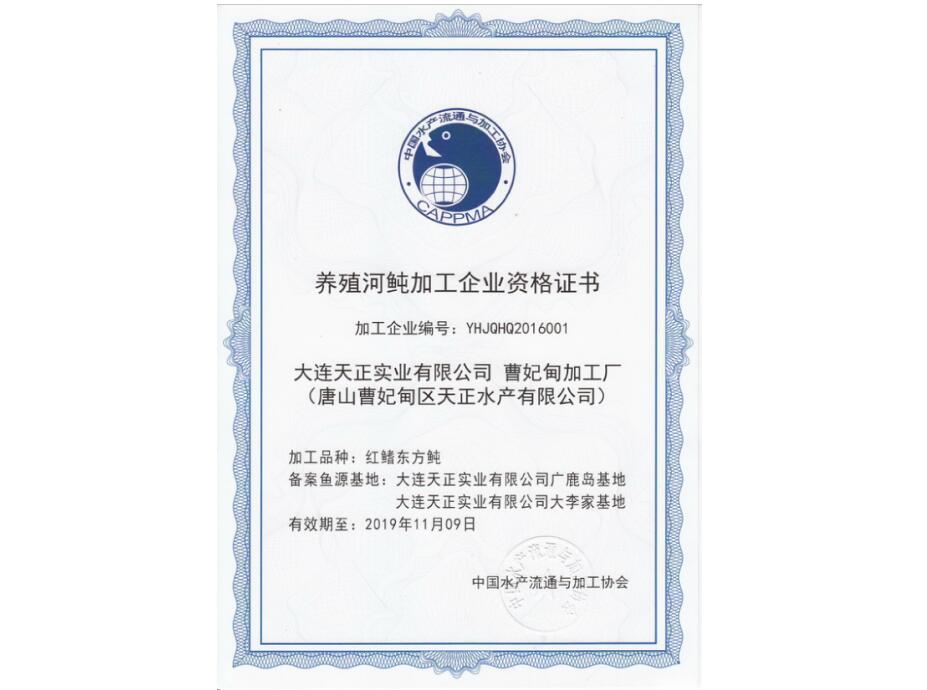 2017年3月6日,天正集團獲中國水產(chǎn)流通與加工協(xié)會正式頒發(fā)《養(yǎng)殖河鲀加工企業(yè)資格證書》