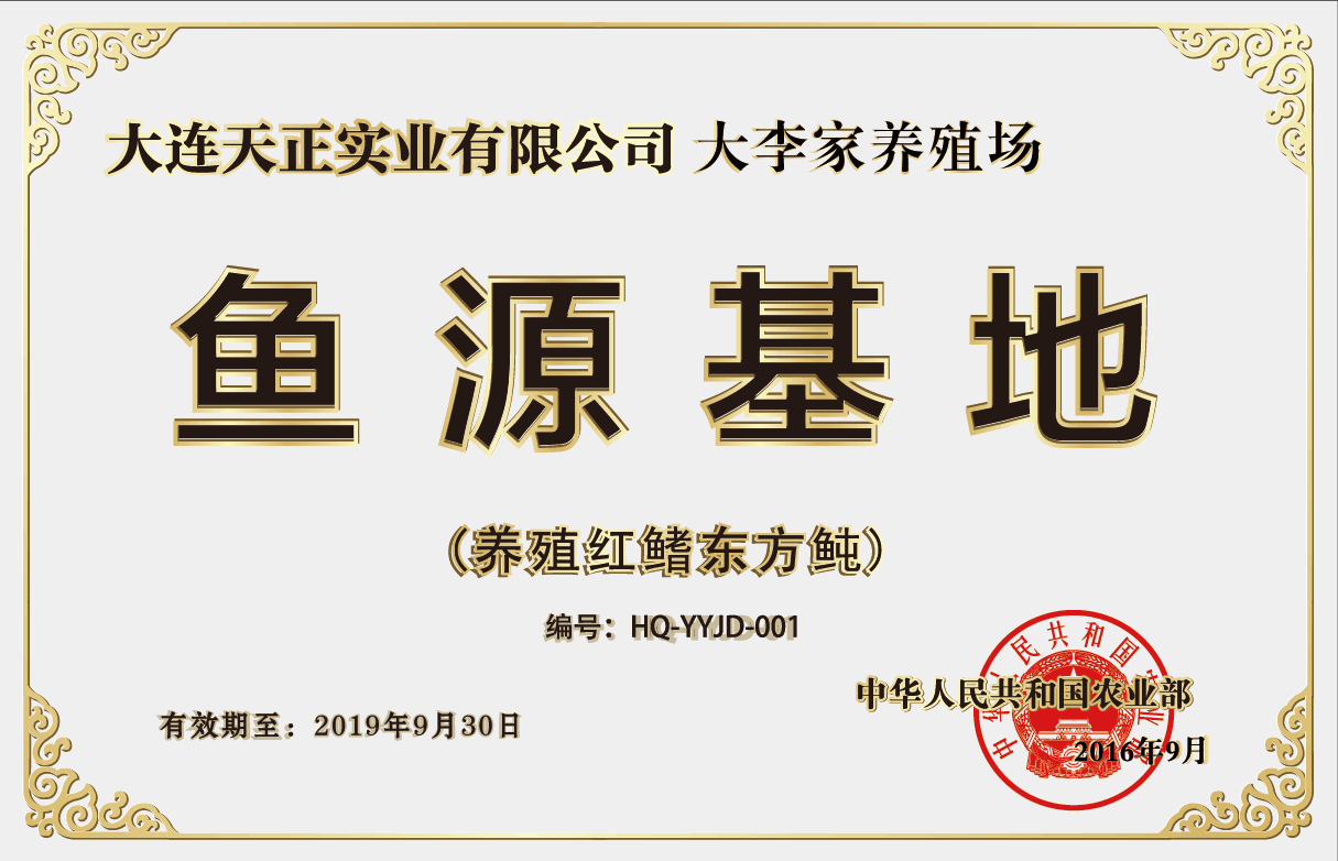 大連天正實業(yè)有限公司廣鹿島基地、大李家基地被評為養(yǎng)殖河鲀魚源基地名單